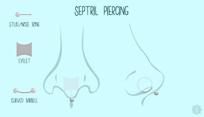 Per quanto riguarda i gioielli, la maggior parte delle persone che sfoggiano un septril sceglieranno un piccolo bilanciere curvo o una borchia posteriore piatta per il foro del septril, e un occhiello, una spina o un tunnel per il setto allungato.