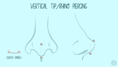 Cercate il rinoceronte? Eccolo qui: Il piercing a punta verticale. Questo piercing al naso, unico e abbastanza raro, corre verticalmente, come il nome suggerirebbe, da appena sopra la punta del naso a appena sotto la punta del naso. A causa della struttura del tuo naso, un bilanciere curvo è davvero l’unico gioiello accettabile per questo tipo di piercing.