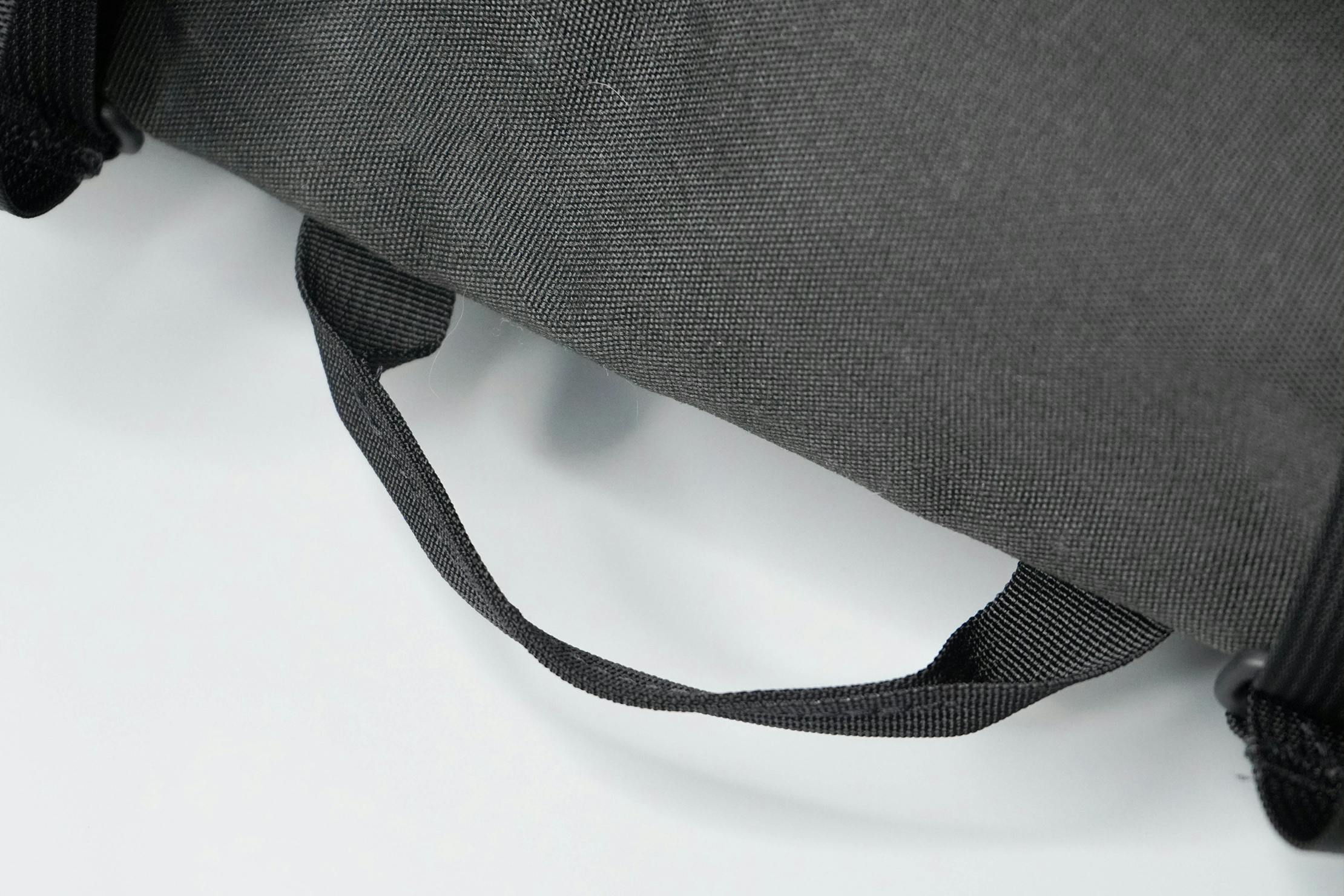 Vais encontrar uma pega na lateral da mochila para se ou quando quiseres levar esta coisa no estilo de pasta. É feita de algumas teias de nylon dobradas e é bastante pequena. Mas o maior problema é que a alça não está posicionada diretamente no meio da lateral da bolsa – está mais perto do painel traseiro. Como resultado, a bolsa inclina-se para a frente e torna-se demasiado frouxa para que a possamos transportar desta forma (isso, e não é um óptimo visual). Para ser franco, nós não achamos esta alça muito útil.