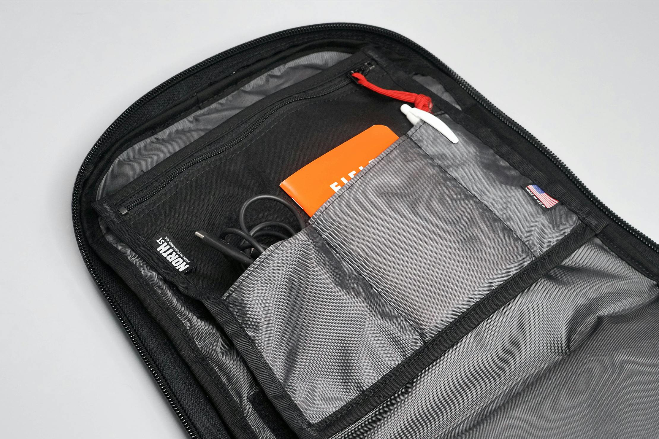 Após você tê-lo aberto, a primeira coisa que você vai notar é que não há muito acontecendo aqui em termos de organização. Na verdade, não há nenhuma organização de que se possa falar. Você tem, no entanto, três alças de velcro ao longo da aba frontal e da parede traseira onde você pode fixar algumas bolsas de acessórios North St. Bags, como o Velcro-In Organizer Pocket Set, para personalizar a sua própria organização. É claro que podes sempre optar por usar as tuas próprias bolsas ou cubos de embalagem. Ou um conjunto diferente de velcro North St. Bags se você achar que funciona melhor para o seu equipamento. Você também tem duas tiras de compressão contra a parede traseira que funcionam para fixar esses cubos de embalagem no lugar, caso você os use, ou qualquer outro equipamento que você tenha dentro.