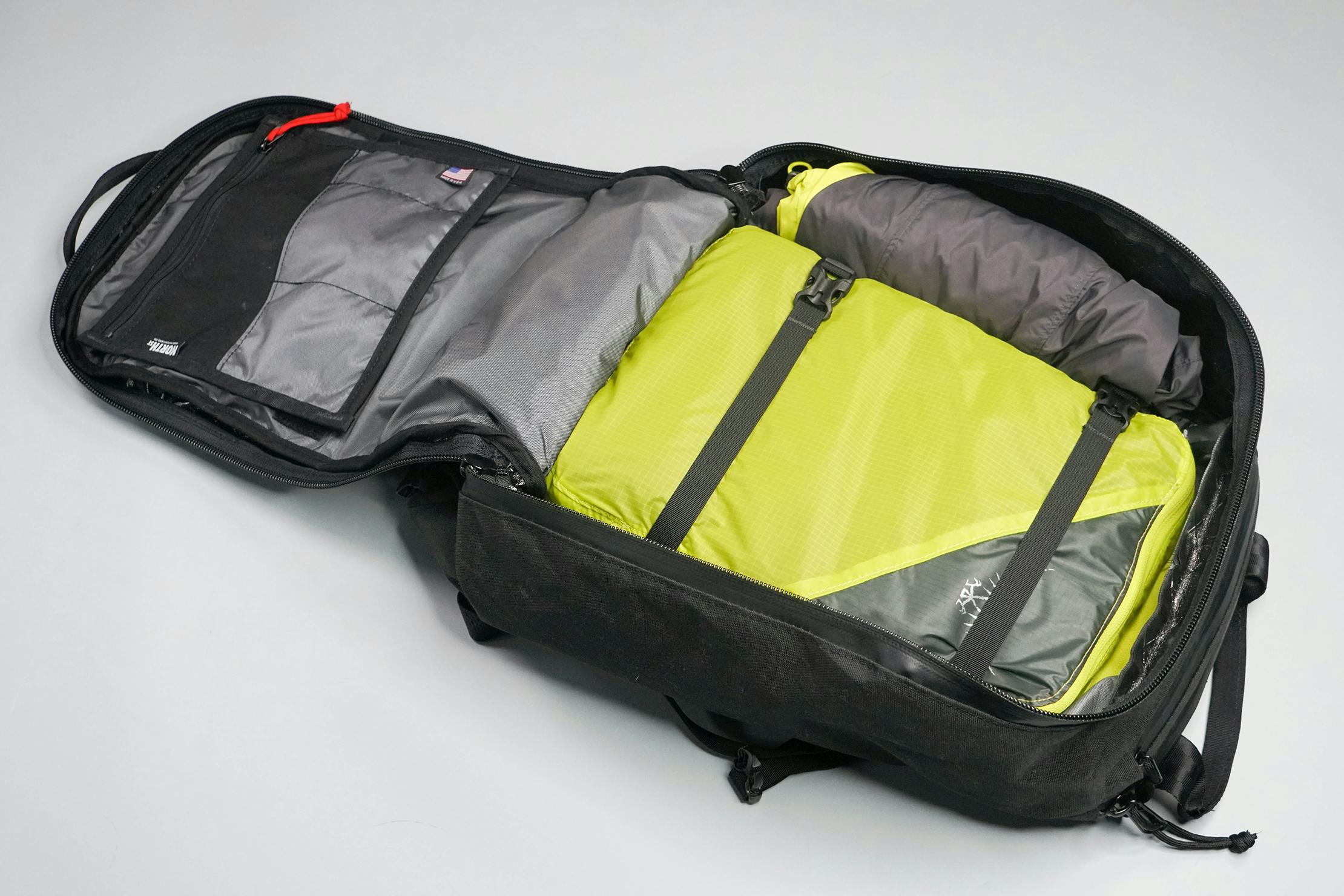 Como com muitas bolsas com tiras de compressão, você terá que desfazê-las para entrar no compartimento principal – e então esta coisa pode se abrir em toda a sua gloria de clamshell-fashion para lhe dar fácil acesso a tudo dentro.