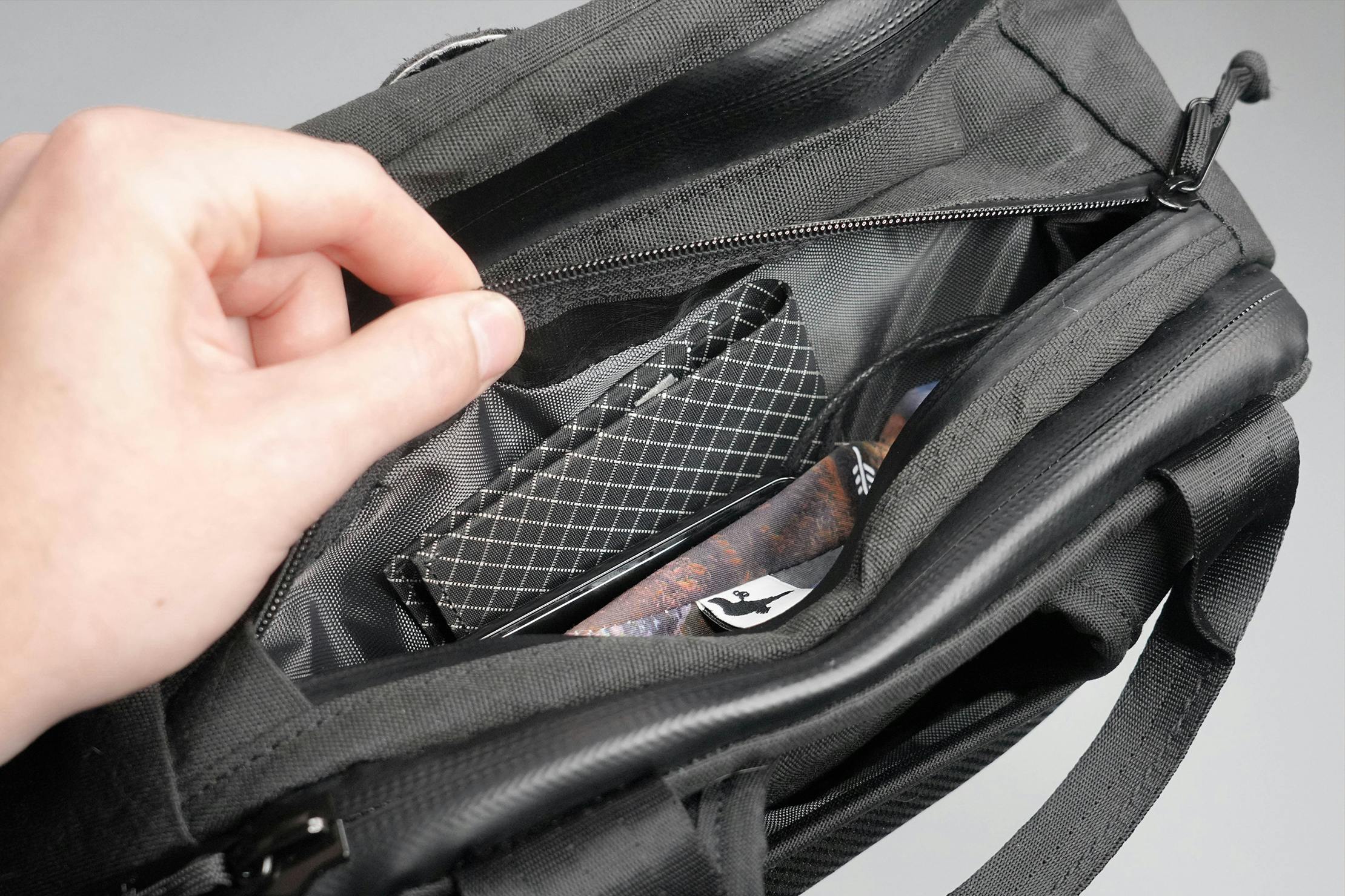 E depois você tem o terceiro bolso de quick-grab no topo da bolsa. É um ótimo lugar para guardar aquele equipamento usado com freqüência que você quer manter à mão – sua carteira, telefone ou até mesmo um par de óculos escuros. Não há aqui um material de forro muito macio (é mais um tecido tradicional swishy), por isso, se você estiver guardando óculos de qualquer tipo aqui, recomendamos que o faça em um estojo de proteção para ajudar a evitar arranhões.